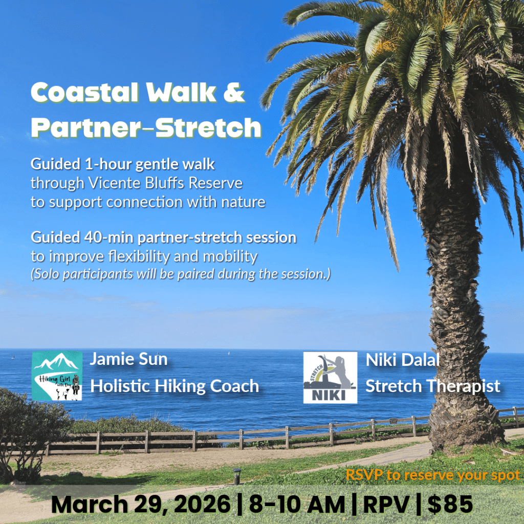 This special event includes a guided walk through the scenic Vicente Bluffs Reserve, followed by a partner‑stretch session designed to support flexibility and mobility. Solo participants are welcome — you’ll be paired during the session.