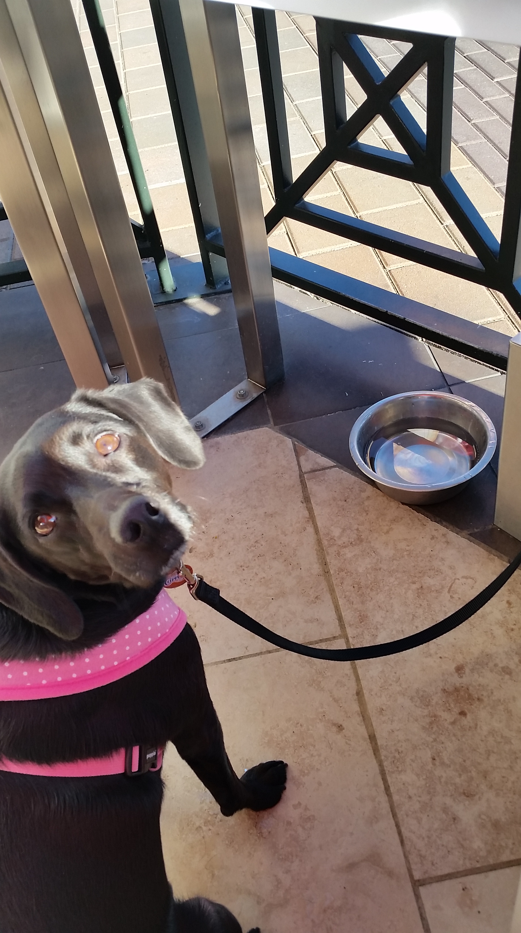 Xena in her pink polkadot travel harness