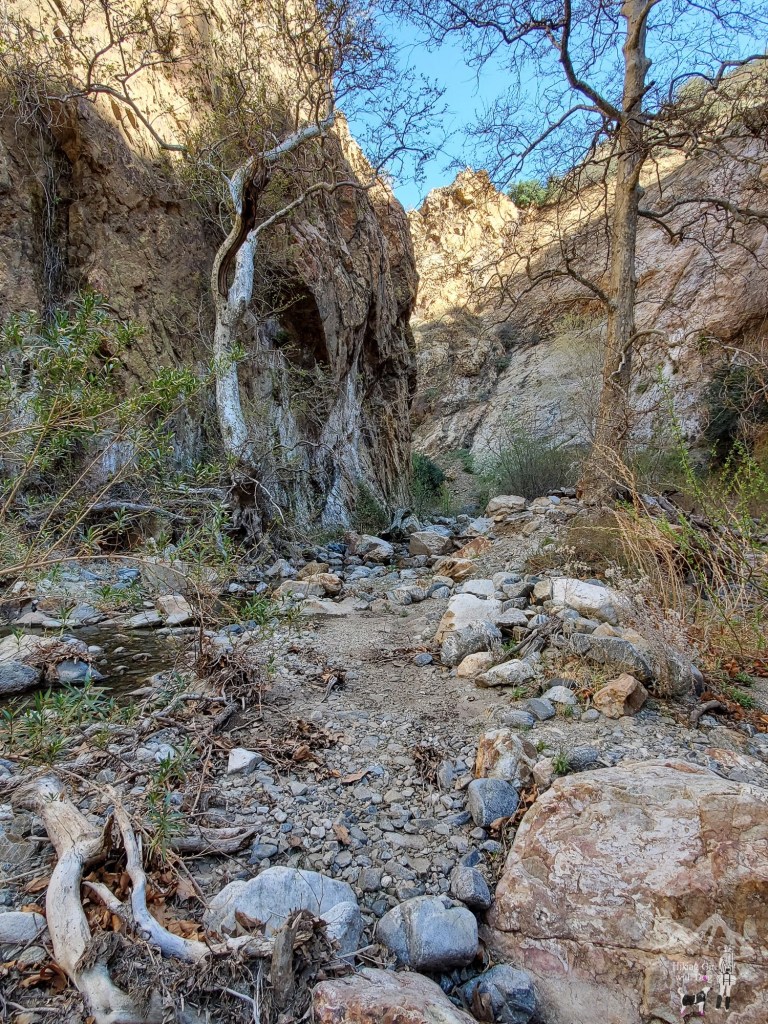 Soon, we hiked through a canyon that offered shade, and the terrain changed between dirt and rocky multiple times. Some sections are all rocks. Proper hiking shoes are recommended.