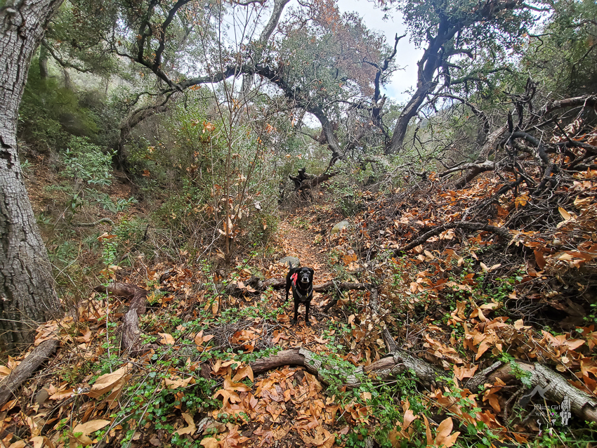 Xena made it look easy, but I tried not to slide down on that slippery rock. The loose ground didn’t help. When I managed to get up to the top, more of the same steep climb was waiting for us. I decided that was enough. We retraced our steps to the fire road and began looking for another way, an easier way, to Hogador Canyon.