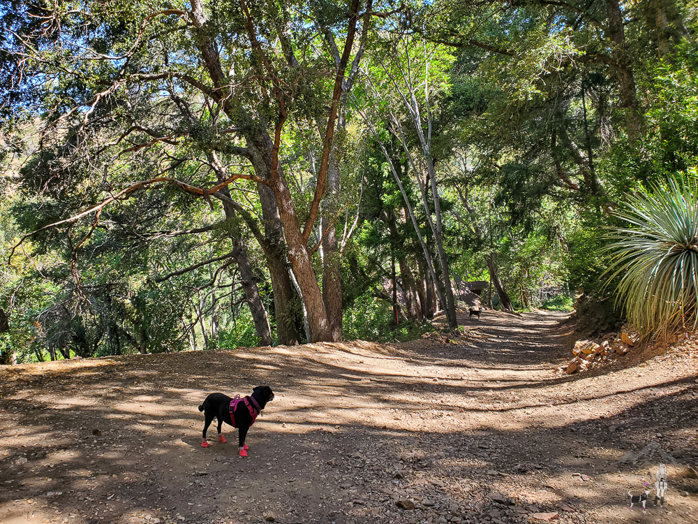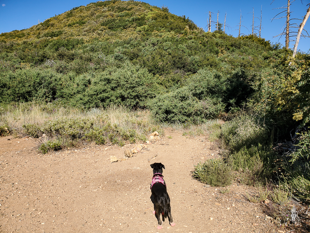 After 2.5 miles, the fire road continued to the left, and we took the small trail to the right, where Xena is facing in the photo below, and began climbing. There is no signage. You will have to track your hike in case there is no one around and you can’t follow other hikers.