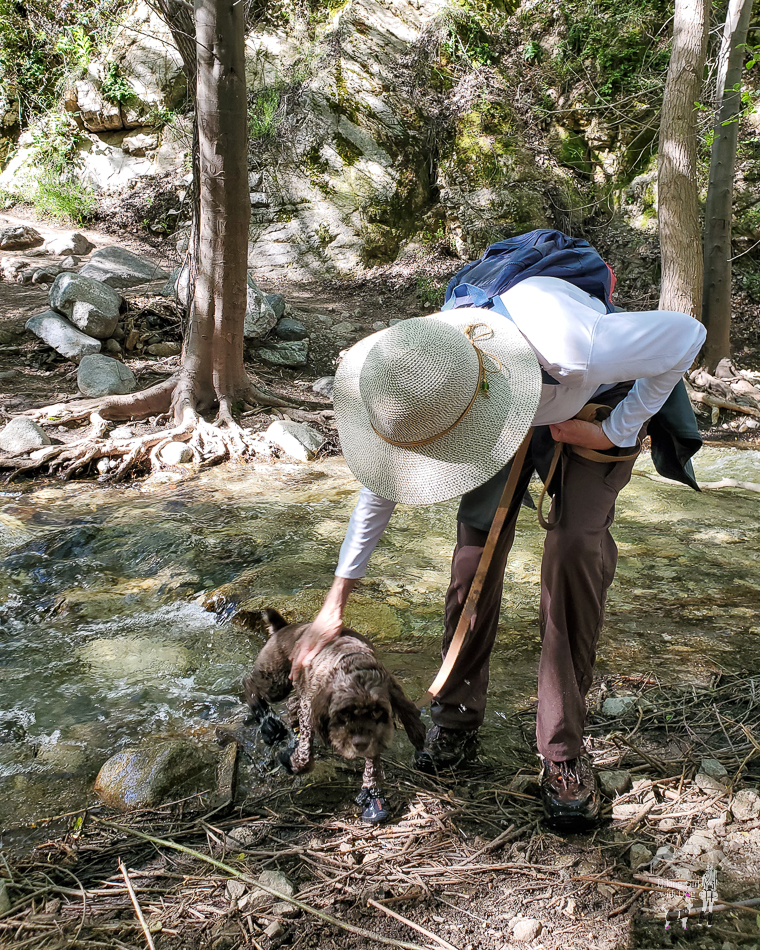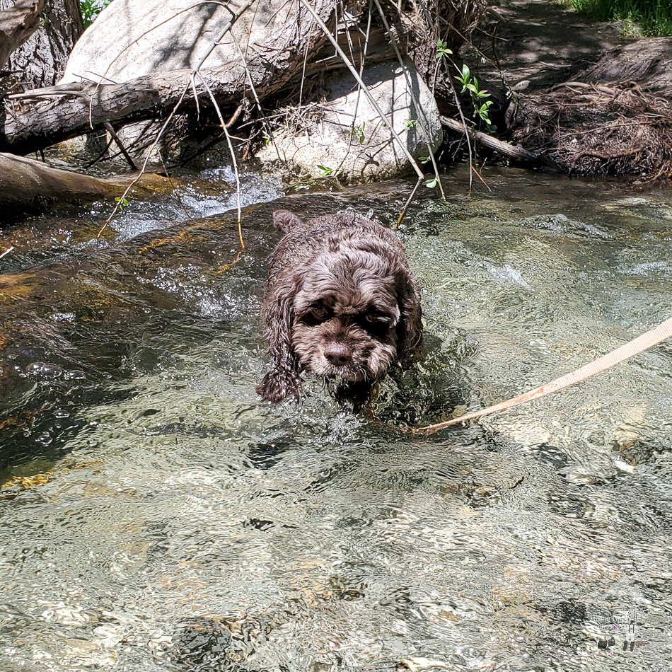 Young Bailey was timid about stream crossing at first, but with lots of encouragement, she eventually became more comfortable. Having to cross multiple times and having Xena there to show Bailey how to do it helped, for sure. Dogs learn faster from other dogs.