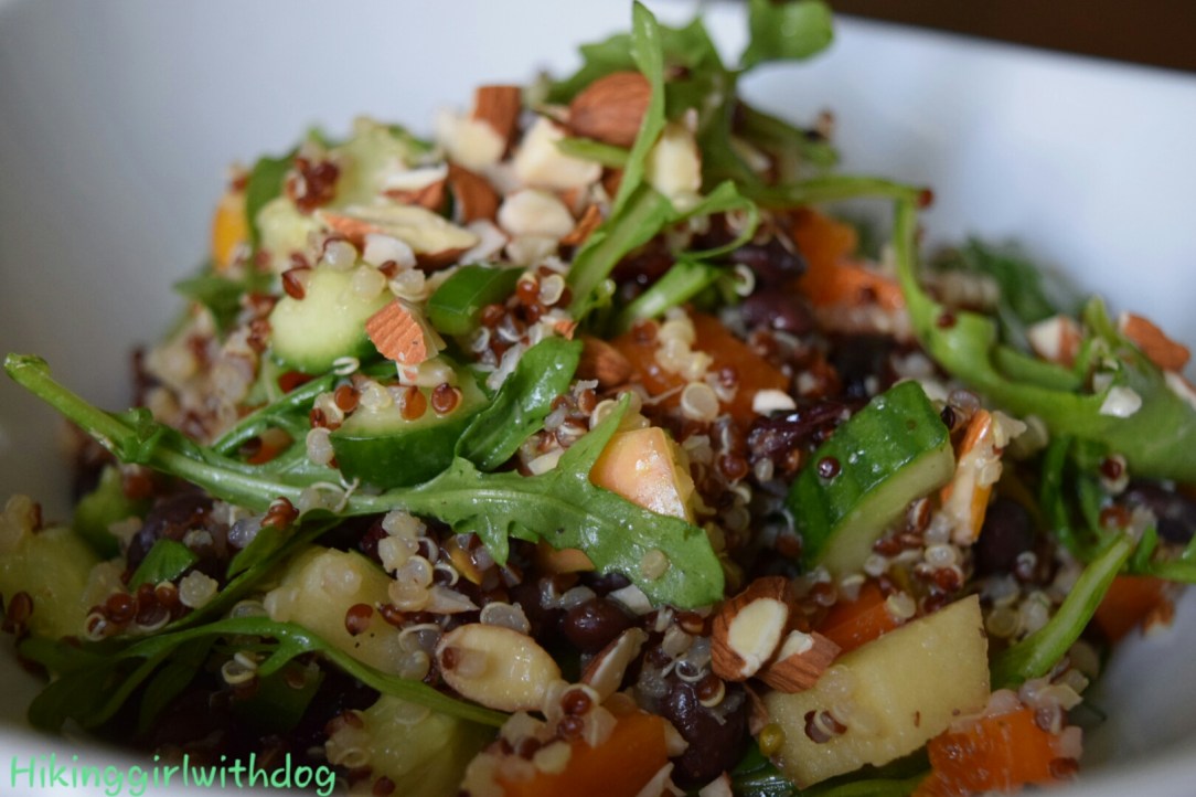 I love quinoa. It’s very versatile. I have replaced my rice with quinoa more than a year ago and never looked back. I also make a variety of salads with it all year around. Here is an entree salad I made yesterday. What’s in the bowl? Cooked organic quinoa Organic arugula Dried cranberries Organic apple